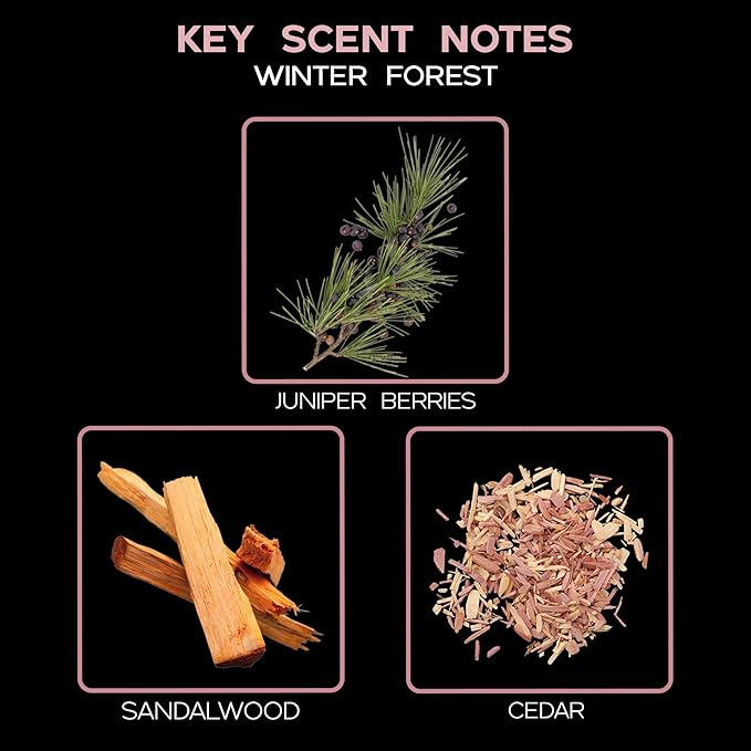 - WINTER FOREST (w/WOOD COASTER) – features the refreshing scent of Fir Needles, Juniper, Sandalwood, and Cedarwood; showcased in our Bell Diffuser, topped with a slender neck and a deep green ribbon accent for an elegant seasonal touch, and includes a real wood slice coaster for cozy lodge appeal; ideal for pine, hunter green, and holiday-inspired décor.