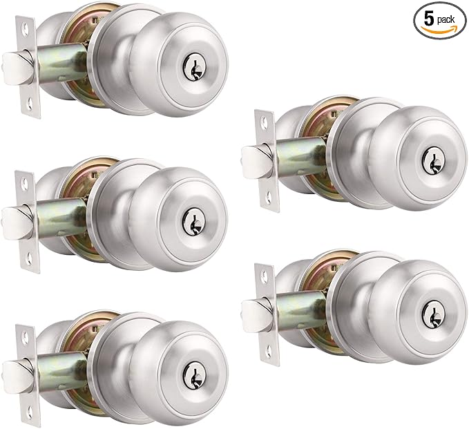 Probrico (5 Pack) Satin Nickel Round Entry Door Knobs Keyed Alike, Exterior/Interior Door Handles Bedroom Bathroom/Front/Offic Doors, Door Lock with Locks and 3 Combo Keys Lock Security
