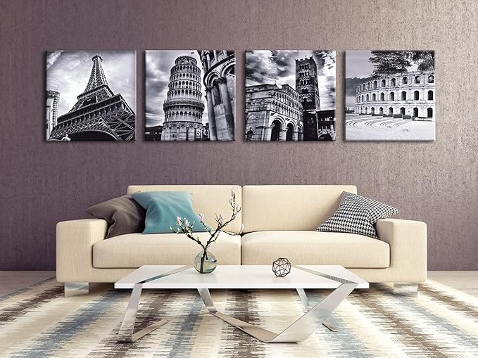 - 4 pcs big gallery wrapped decorative pretty black and white European building canvas paintings wall art prints ready to hang for home decorations wall decor. Each panel has a black hook already mounted on the wooden bar for easy hanging out of box.