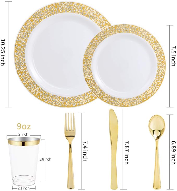 - BEST CUSTOMER SERVE: If you have any unsatisfactory, please contact us in time by email, we will give you a satisfactory solution as soon as possible. Your feeling of using plastic gold plates with cups and silverware is what we value most