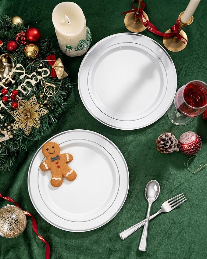 bUCLA 100Pieces Silver Plastic Plates - 10.25inch Silver Rim Disposable Dinner Plates - Ideal for Weddings, Parties & Christmas