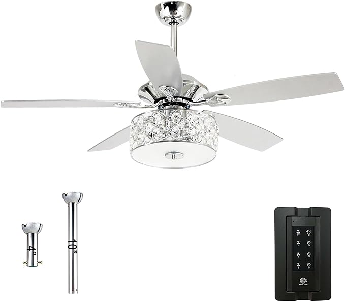 - LIGHTING & CEILING FANS: It's a best combination of ceiling fan and crystal light, stylish and elegant design, equipped with ultra-quiet and reversible motor, provide you cool wind and bright light. Polished chrome finished. Ideal for bedroom, living room, kitchen, dining room, covered patios, etc.