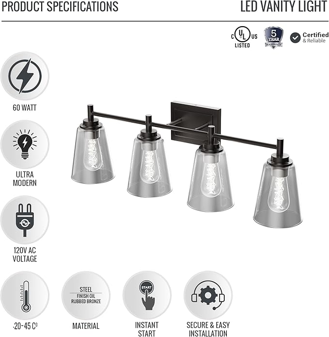 - ✔️【UL LISTED AND WARRANTY】Our vanity light fixture is UL Listed, meeting the highest industry standards for electrical safety. Install with confidence, knowing your space is protected. Our bathroom vanity light that comes with a 5-year warranty, ensuring durability and long-lasting performance.