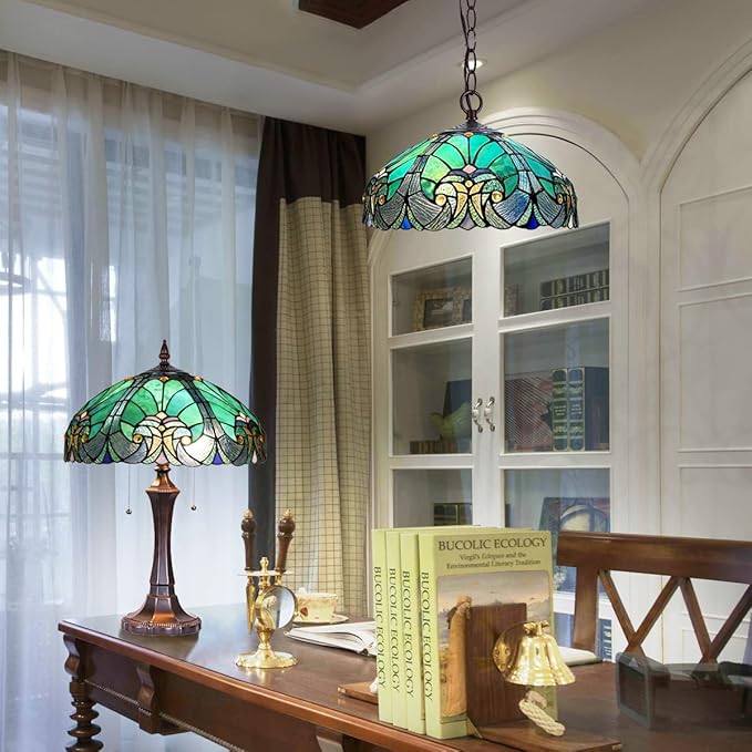 - 【Definitely Eye-Catching Antique Living Room Lamp】 Victorian style sea green tiffany lamp shade shines the light through the glass and creates beautiful patterns. All of the colors are vibrant and evenly toned when light on, it gives off a muted and relax light. Absolutely will look stunning in your room and be the focal point of adding a touch of elegance for home and office.