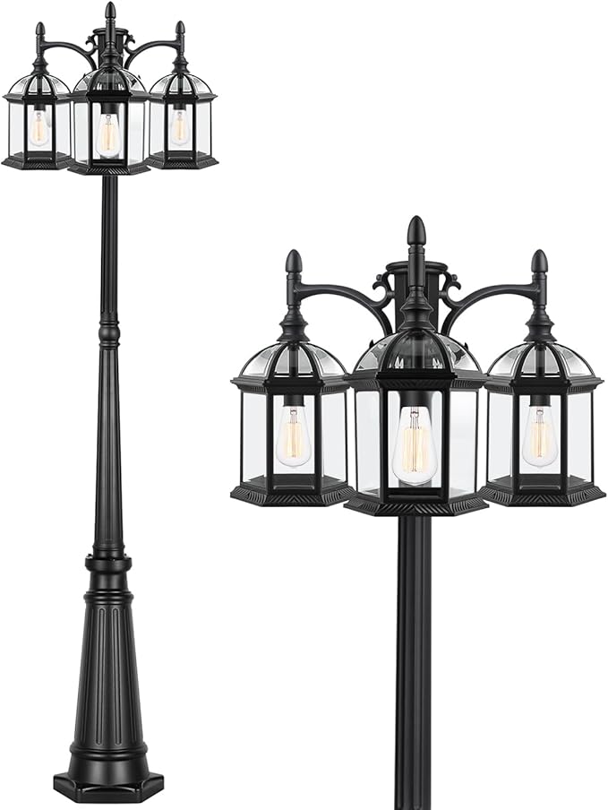 - Hardwired, Not Solar: this hardwired lamp post light fixture is designed for all-season outdoor lighting with more sufficient and stable light than solar lamp post, no need to worry cloudy or raining days. This street lamp requires 3 x 100-Watt max medium base light bulb (bulb Included).