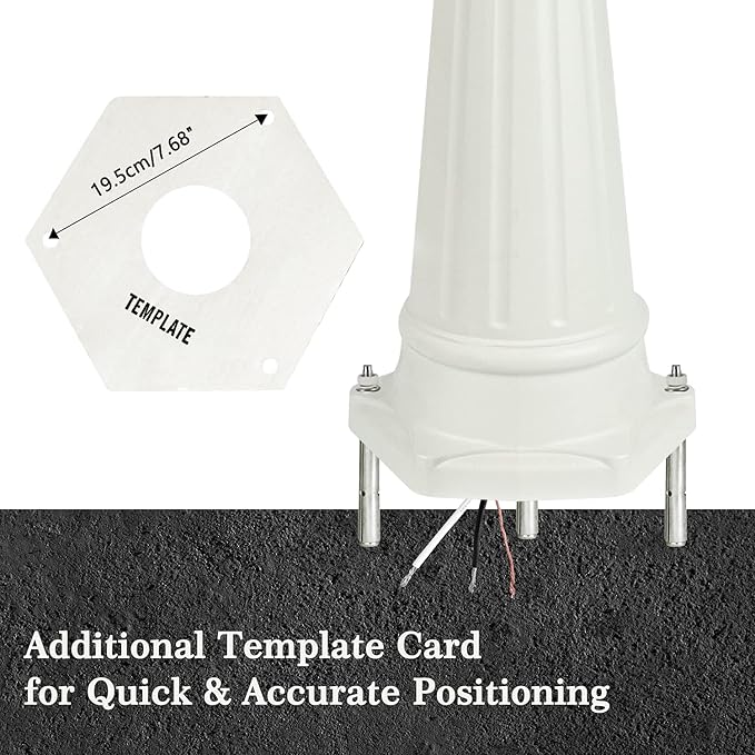 - 【Easy Installation】Additional template card is included for quick positioning. You can install it in fresh concrete or replace your previous lamp post with existing bolt of 7.68” apart from center to center. All mounting accessories are included for easy installation. !!!Note: There is a need to hire an electrician to do the installation. Masonary work in the ground should be prepared first. Such as: dig holes, stick the bolts down and pour fresh concrete, etc.