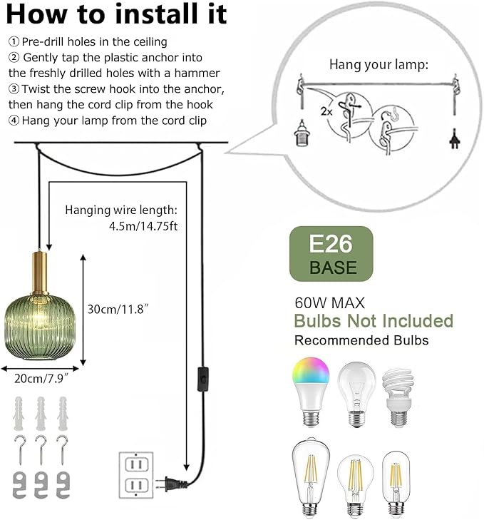- 【Plug in Pendant Lighting with Cord】Set up easily with adjustable 14.75 feet of cord for this hanging ceiling light plug in. Hanging plug in pendant light for flat, sloped, or vaulted ceilings—ideal for renters. Includes screw hooks, upgraded metal cord clips and dry wall anchors, follow the step by step instructions for a quick and simple installation.