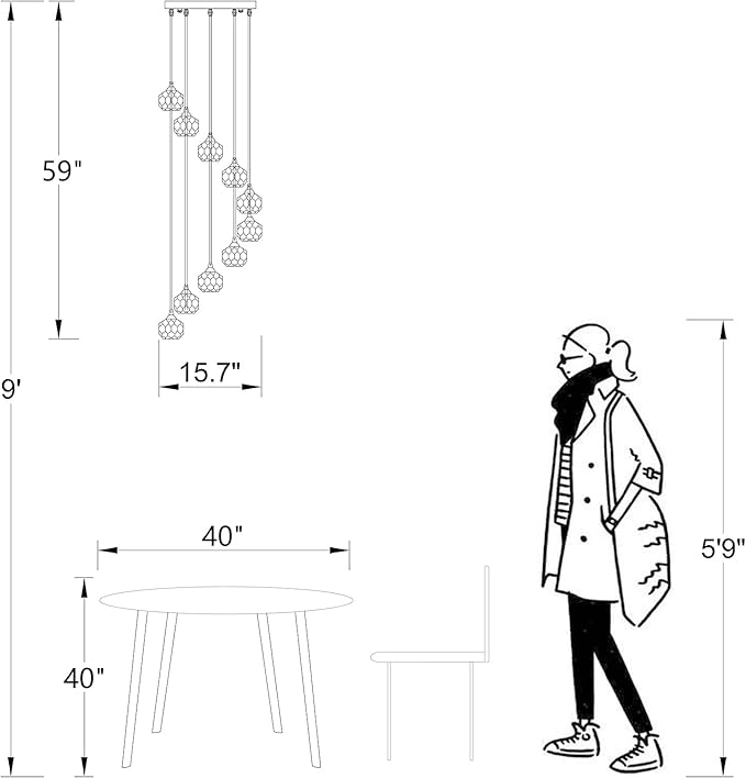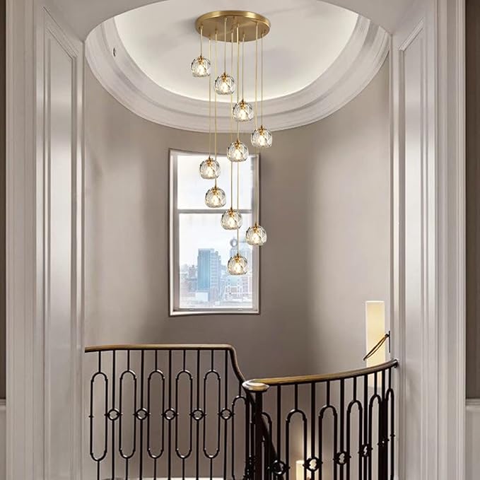 - Adjustable Height: The crystal cluster pendant light comes with a long hanging cord, you can adjust the hanging cord according to your needs. The modern crystal chandelier for staircase can also be mounted on a sloped ceiling and vaulted ceilings