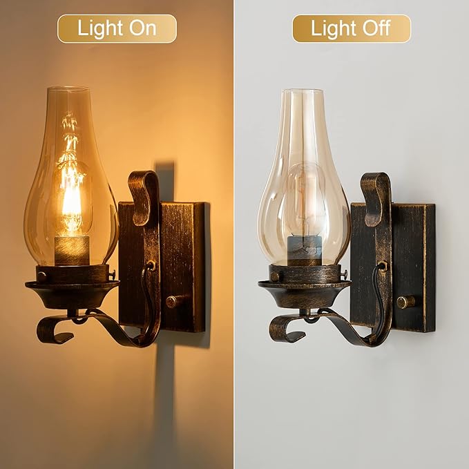 - Retro Kerosene Lamp Design; With a hand-painted kerosene lamp shape design, this wall sconce is full of primitive and rustic elements. Paired with the unique design of the amber glass secured with screws, it completes the rustic look and makes a low-key and country style to your room.