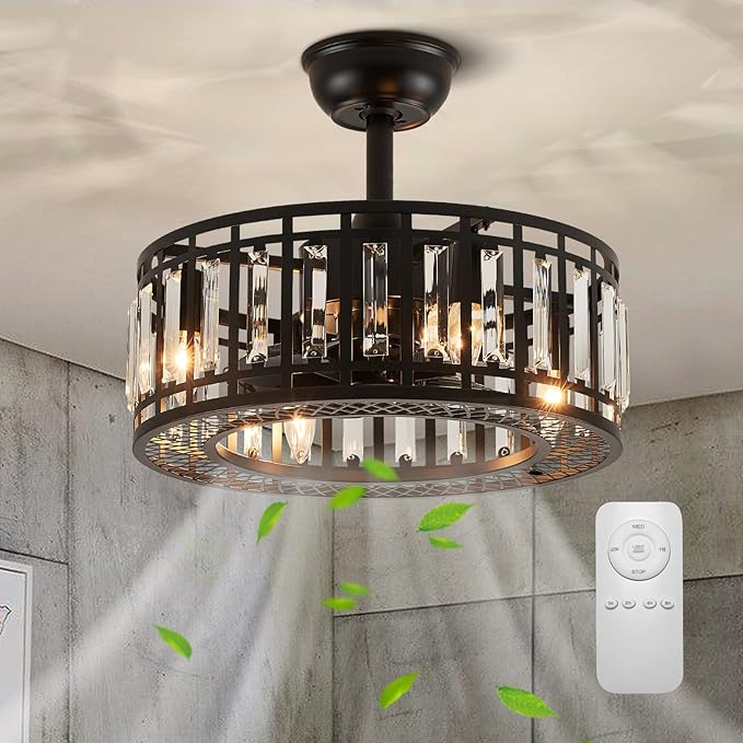 18" Black Crystal Caged Ceiling Fan with Light and Remote, Industrial Caged Chandelier Fan 8-Blade Fandelier Modern Enclosed Ceiling Fan for Kitchen Dining Room Living Room