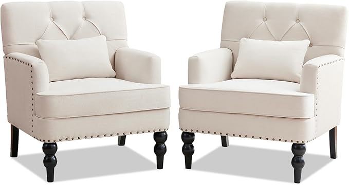 HUIMO Tufted Club Chair Set of 2,Accent Chair with Lumbar Pillow, Upholstered Button Armchair, Fabric Sofa Chairs for Bedroom, Living Room, Mid Century Modern with Studded Reading Chair(2,Beige)