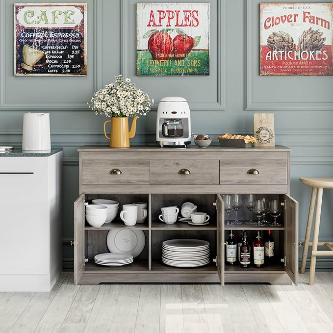 - Large Storage Buffet Cabinet: Dimensions: 53.5"Lx15.6"Wx34.1"H. Featuring 3 drawers on top and 3 cabinet doors on the bottom, the buffet table can provide large storage space that can hold some wine bottles, seasoning cans, cutlery, food, pots and pan,etc. It keeps your kitchen and dining room clean and tidy. The drawers are perfect for your kids laptop and school supplies.