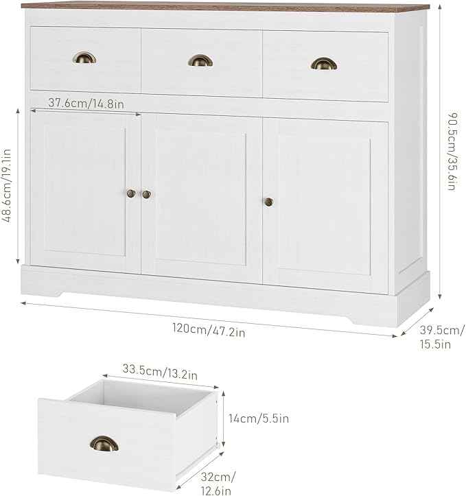 - Large Storage Buffet Cabinet: Dimensions: 47.2"Lx15.6"Wx36"H. Featuring 3 drawers on top and 3 cabinet doors on the bottom, the buffet table can provide large storage space that can hold some wine bottles, seasoning cans, cutlery, food, pots and pan,etc. It keeps your kitchen and dining room clean and tidy. The drawers are perfect for your kids laptop and school supplies.