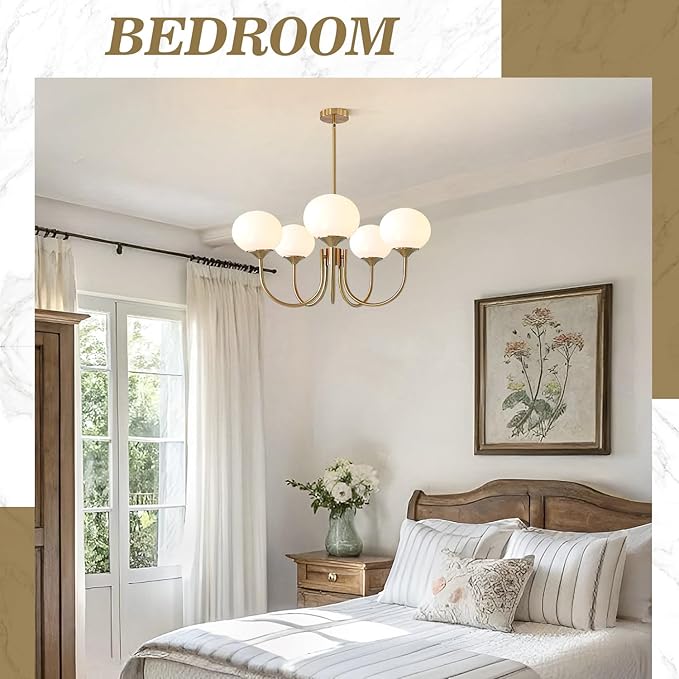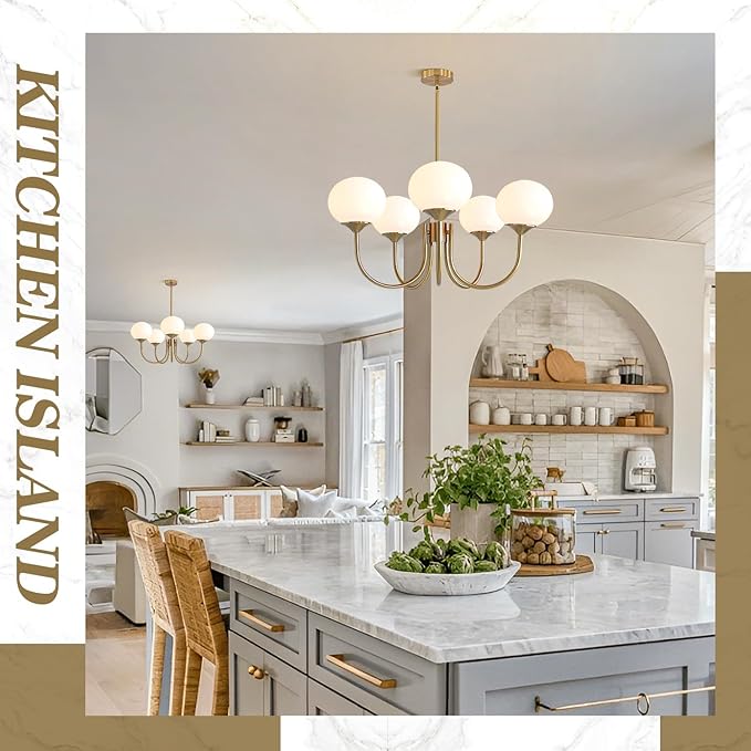 - 【Modern 5-Light Globe Sputnik Chandelier】The 5 light brushed gold chandelier features 5 graceful lamp arms made of iron with superb gilded finish accents,each holds exposed white glass globe lampshade. The gold glass chandelier blends vintage and modern design concepts that set it apart from traditional chandeliers, presents a classic and luxury modern aesthetic piece.