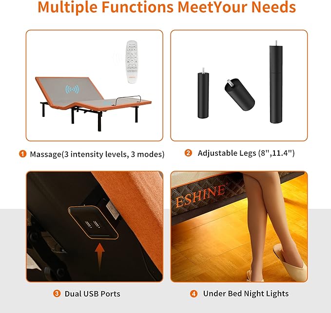 - MULT-FUNCTION DESIGN - Adjustable legs allow you to adjust the height to 8 inches, and 11.4 inches. For our adjustable bed frame, many humanized designs (USB Ports and Under Bed Night Lights) will make your life very convenient.