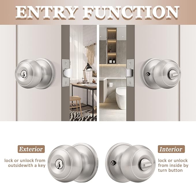 - 【MATERIAL】:Stainless Steel; Color: Satin Nickel; Stainless Steel Plated Lock set with Satin Nickel finish that will not rust, durable for long lasting use. Great Quality and High Security: Conformed with ANSI Grade 3 Exceeds 200,000 cyles and 5 pins brass tumbler cylinder; Solid Column security bolt for anti-sawing protection