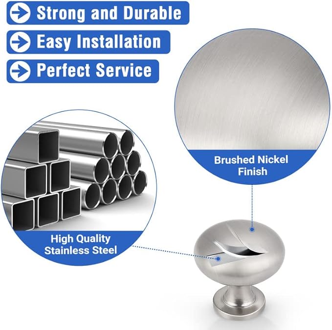 - DIMENSION: Our round drawer knobs: Diamter:1-3/16"(29.5mm); Height:1-1/8"(28.6mm),Leave enough space for pull and out.Finish:Brushed Nickel.