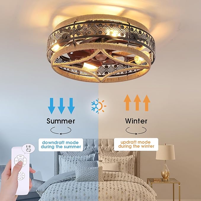 - VINTAGE BEDROOM FAN LIGHT -- Original industrial retro design, upgrade 17.5'' iron caged shape, 8 ABS fan blades. With handmade hemp rope, a combination of classical and fashion, suitable for bedroom, study, living room, dining room, corridor, etc.