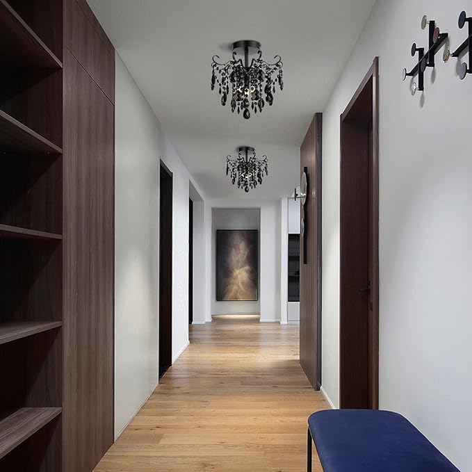 Mini Black Chandelier Crystal Ceiling Light(3-Light,12-Inch),Small Chandelier Flush Mount Ceiling Light Fixtures for Bedroom,Hallway,Entryway,Closet