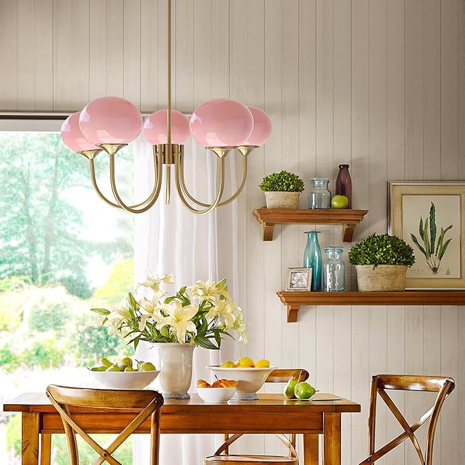 - 【Modern Design】This is a popular 5 lights pink glass chandelier in a sweet pink, a color that is not only warm but attractive. Very contemporary, the first impression is that it is powerful and easy to match. With pink as the main color, you can add a romantic and warmth to your home or office, making your space more comfortable.