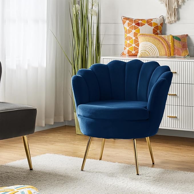 HULALA HOME Modern Velvet Accent Chair with Shell Shaped Back, Cute Living Room Bedroom Armchair with Gold Legs, Comfy Upholstered Vanity Chair for Makeup Room, Navy