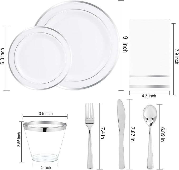 - ELEGANT AND EXQUISITE DESIGN:Our premium silver disposable plates have a unique and exquisite design. The edges of these white plastic plates with silver trim are twice silver plated, elegant and delicate. And these shiny silver plastic cutlery make the party even more glamorous.