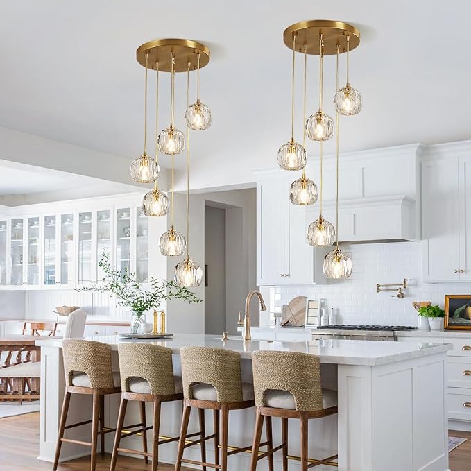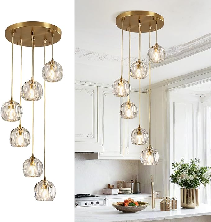 - Dimension & Light Bulb Included: The gold crystal kitchen island pendant lighting canopy size: 11.8”(30cm), crystal lampshade diameter: 4.3”(11cm), hanging cord: 59.1”(150cm) (If you need longer hanging cord, we could customize it for you). Light source: G9, voltage: 110-240V for worldwide. Adjustable 6-Light pendant light fixture could be fully dimmable when used with dimmable bulbs and a compatible dimmer switch