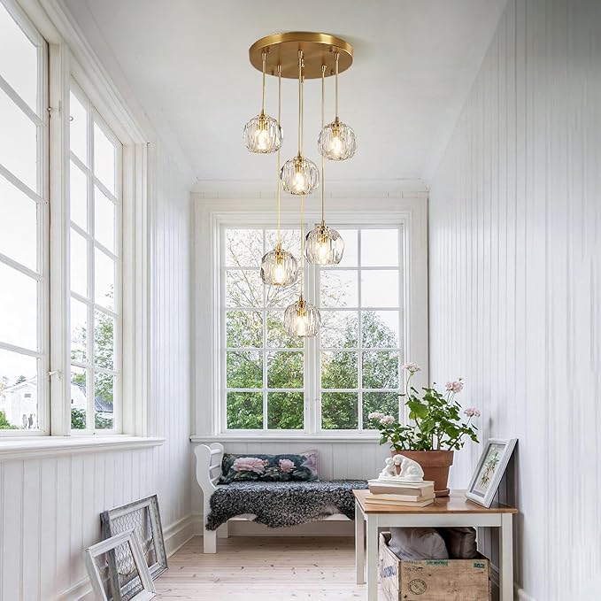 - Luxury Crystal Pendant Light: The crystal and gold pendant light features clear cut crystal and round canopy in brushed brass, creates a mid-century modern ceiling hanging lights, that have a charm glow to illuminate your living spaces. When you turn on the light, the lighting will reflect through the crystal, adding a romantic, fancy and shining atmosphere to your room