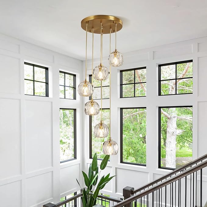 - Fully Adjustable Height: The large stairwell cluster pendant light comes with adjustable cords for a custom look up to 59.1" high, you can adjust the hanging cord according to your needs, perfect for high ceilings and low ceilings. The crystal semi flush mount ceiling light fixture could also be mounted on a sloped ceiling and vaulted ceilings