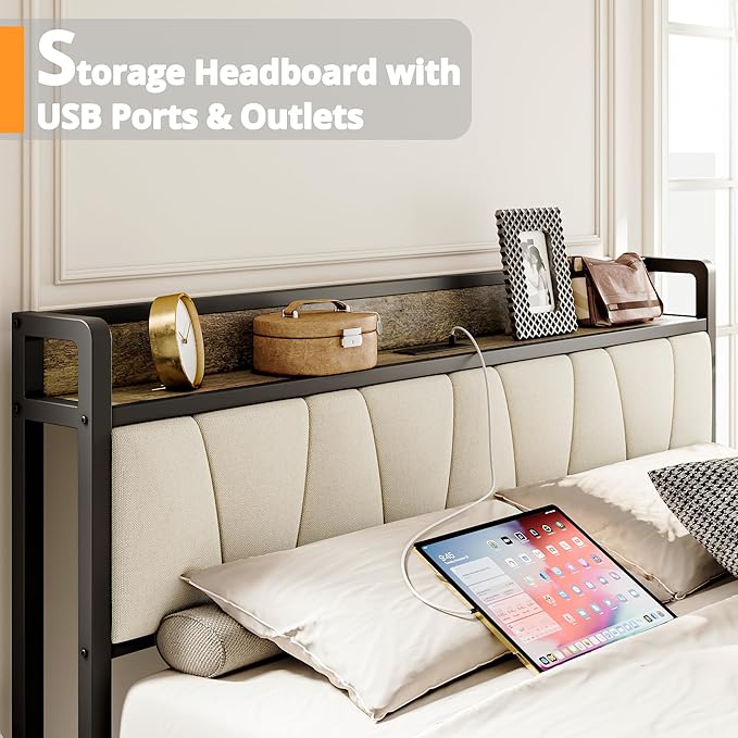 LIKIMIO King Bed Frame, Storage Headboard with Charging Station, Solid and Stable, Noise Free, No Box Spring Needed, Easy Assembly (Walnut and Beige)