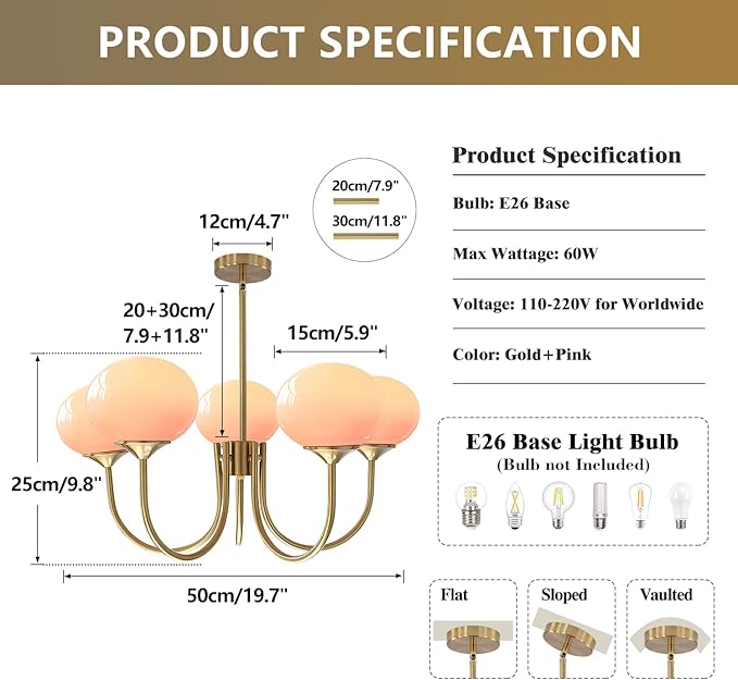 - Pink Bubble Light Size: The pink glass ceiling light fixture width: 19.7”(50cm), height: 9.8”(25cm), glass shade diameter: 5.9”(15cm), extension rod: 7.9”+11.8”(20+30cm), ceiling canopy: 4.7”(12cm). Light source: E26 (bulb not included), Max: 60W, voltage: 110-220V for worldwide