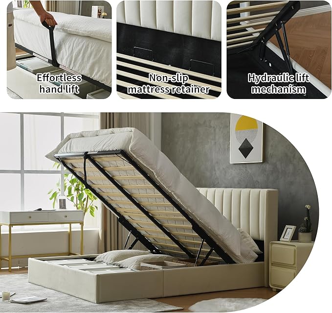 - [EASY OPENING AND PLENTY OF STORAGE SPACE] Equipped with a hydraulic lift system, the mattress can be easily raised to reveal a spacious storage compartment. This hidden space provides ample room for bedding, seasonal items or other necessities. Features an anti-fall device to prevent the mattress from slipping. A dust cloth on the bottom ensures that your stored items remain clean and dust-free.
