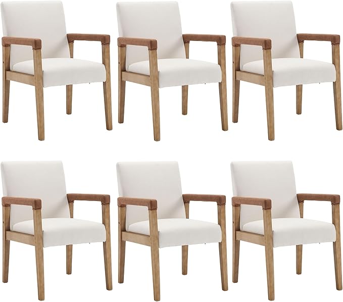 Mid Century Modern Dining Chairs Set of 6 Linen Fabric Upholstered Accent Chairs Comfy Kitchen Chairs with Solid Wood Frame Armchair for Living Room, Ivory