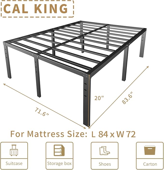 20 Inch California King Size Bed Frame, No Box Spring Needed, Heavy Duty Black Metal Platform Mattress Foundation with Steel Slats, Non-Slip Noise Free Easy Assembly, Large Storage
