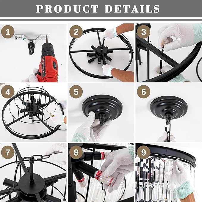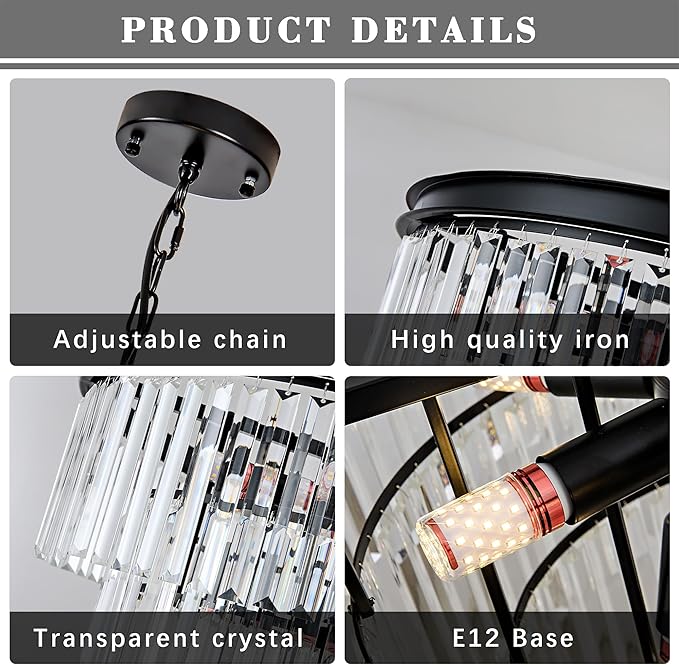 - 3-TIER CRYSTAL CHANDELIER DESIGN: This black 6-light crystal chandelier has a very fine appearance, the metal baking paint shell plus luxury K9 crystal glass lens The fine craftsmanship and elegant lines make it obvious at a glance that it is of high quality.