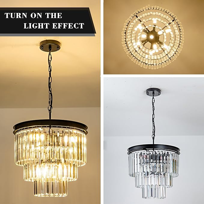 - HIGH QUALITY CRYSTAL: Luxury K9 crystals have higher light transmittance, and go with the solid metal frame in matte black that features a classic modern look. 3-tiers of crystal shape combine fancy and elegant elements with eye-catching results, you will see the beautiful lighting effect on the ceiling when you turn on the light, all the crystals will reflect the pendant lighting super sparkling.