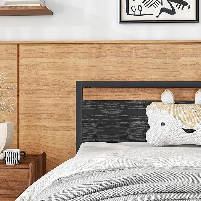 BOFENG Twin Bed Frame with Wood Headboard,Metal Single Platform Bed Frame Twin Size No Box Spring Needed,Heavy Duty Metal Slats Support,Noise Free,Single Bed Base,Easy Assembly,Black