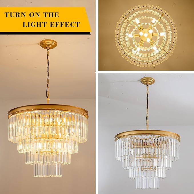 - HIGH QUALITY CRYSTAL: 10-Light Luxury K9 crystals have higher light transmittance, and go with the solid metal frame in electroplated gold that features a classic modern look. 4-tiers of crystal shape combine fancy and elegant elements with eye-catching results, you will see the beautiful lighting effect on the ceiling when you turn on the light, all the crystals will reflect the pendant lighting super sparkling.