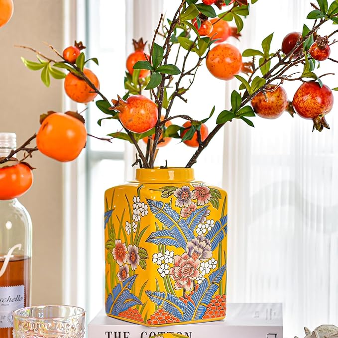 Sungmor Decorative Ceramic Ginger Jar with Lid, Square Ceramic Storage Jar Tea Canister, 8.2" Hand Painted Floral Pattern Porcelain Vase for Table Centerpiece, Yellow Glazed Ginger Jar for Home Decor