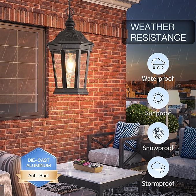 - 【Waterproof & Weather Resistant】Our exterior hanging porch light is made of die-cast aluminium, This outdoor hanging lantern is durable, waterproof and weather-resistant. With its excellent weather-resistant capabilities, it can perfectly match your front door, porch, patio, garden, backyard, entryway etc.