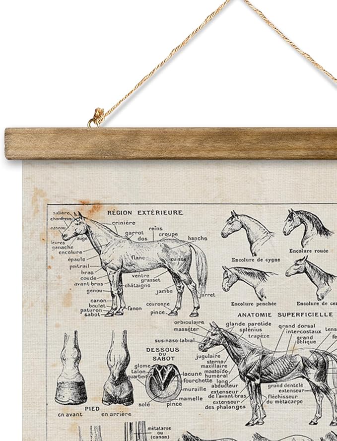 XIAOAIKA Antique-Style Equine Anatomy Chart - Vintage Horse Illustrations Wall Art with Wooden Scroll Frame - Equestrian-Themed Home Decor, Ideal for Horse Lovers and Educators 20 x 30 Inches
