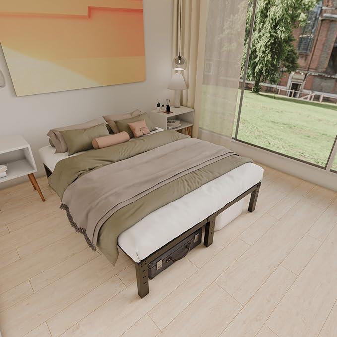 - HEAVY DUTY PLATFORM BED FRAME: 9 bed legs for great support, stable and no cracking after the assembly. Strong steel slats offer large weight capacity. Support up to 3000lbs.