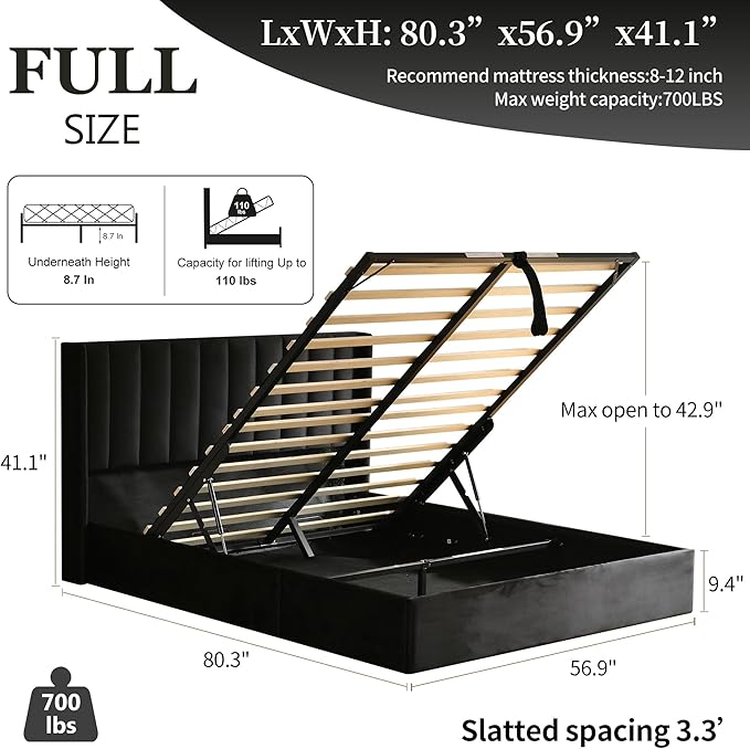 - [PRODUCT DIMENSIONS] This bed measures 80 inches L x 57 inches W x 45 inches H and is designed for use with an 80-inch mattress, 8-12-inch mattresses are recommended, with a weight capacity of up to 700 pounds. The hydraulic storage system provides ample space underneath the wooden slats, eliminating the need for a box spring.