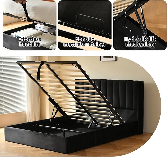 - [EASY OPENING AND PLENTY OF STORAGE SPACE] Equipped with a hydraulic lift system, the mattress can be easily raised to reveal a spacious storage compartment. This hidden space provides ample room for bedding, seasonal items or other necessities. Features an anti-fall device to prevent the mattress from slipping. A dust cloth on the bottom ensures that your stored items remain clean and dust-free.