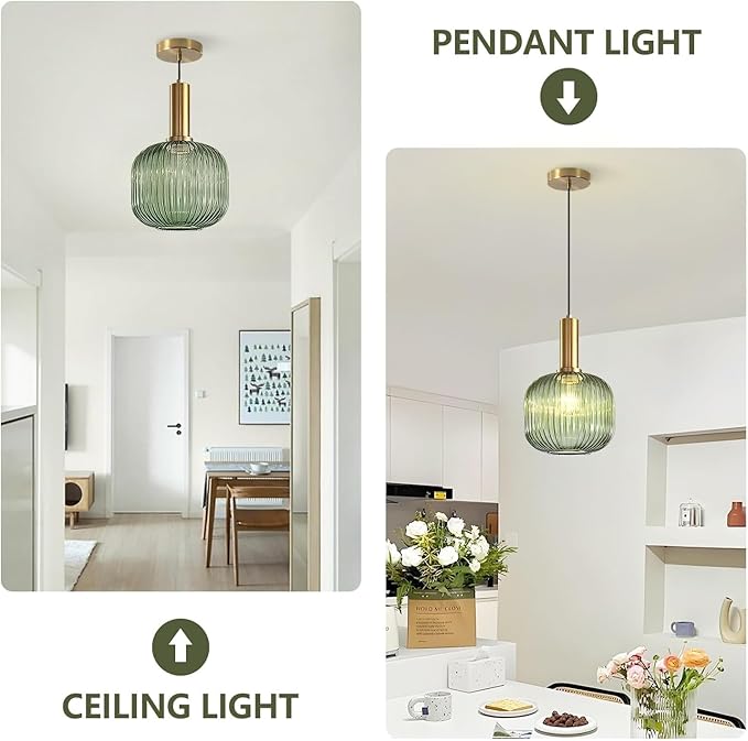 - Striped Glass Shade with Open Design: Large dining room green ceiling hanging light with striped glass shade, delicate texture and even light transmission. The main body of this antique brass pendant lights kitchen island is made of high-quality metal, the combination of metal and glass makes this pendant lamp full of advanced feeling and showcase your personal decor style. The glass shade bottom is open, make it easy to change light bulb and maximizes lighting