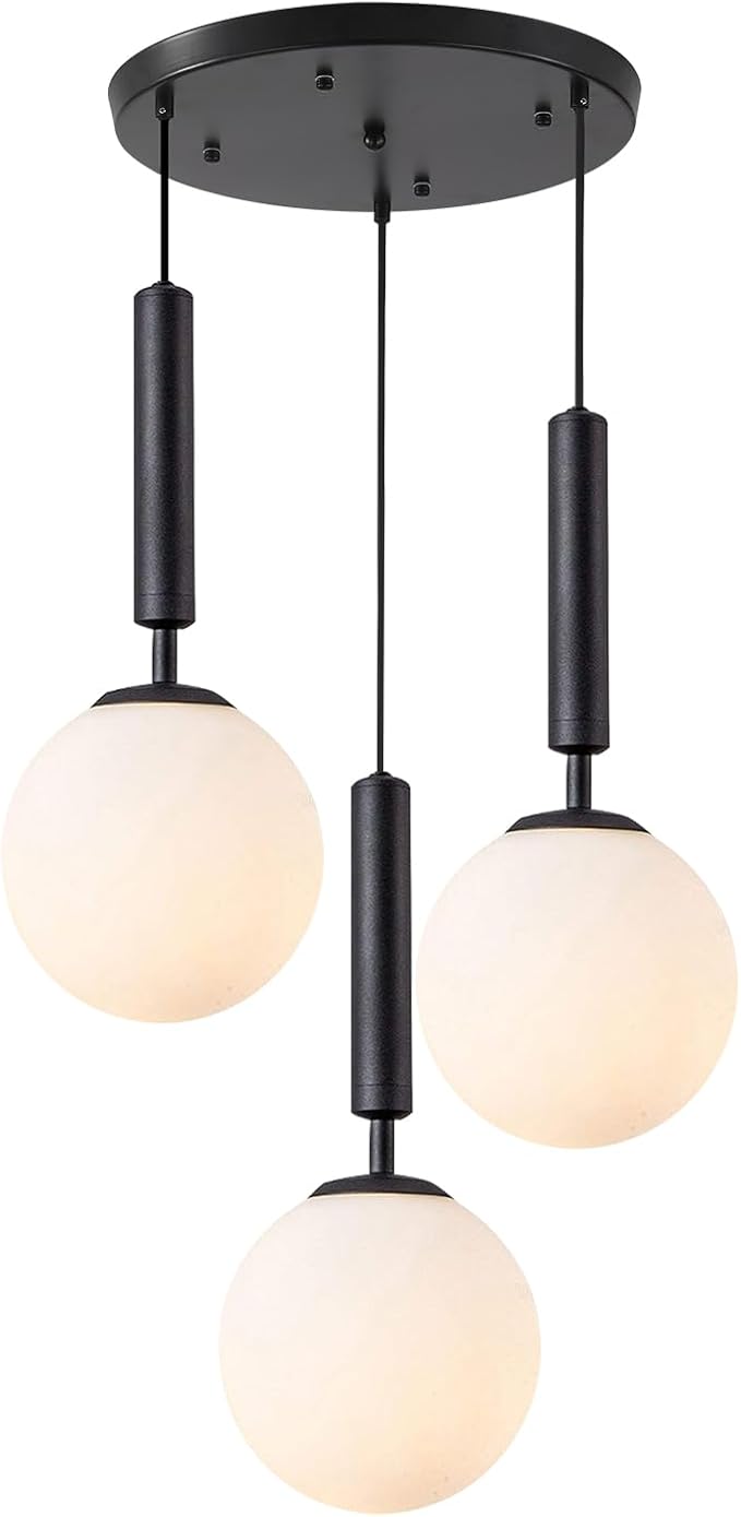 - 【Black 3 Light Pendant Lighting】The black and glass pendant ceiling chandelier feature with 3 white globe glass shade and matte black finish canopy and black accent lamp body, perfect for modern, contemporary, and farmhouse decors. This black kitchen pendant lighting add classic and elegant beauty to any interior with its round globe glass shade look. The 3-light cluster pendant light in simple clean lines completes the look with a hint of classic modern character and brings a touch of brilliance to any space.