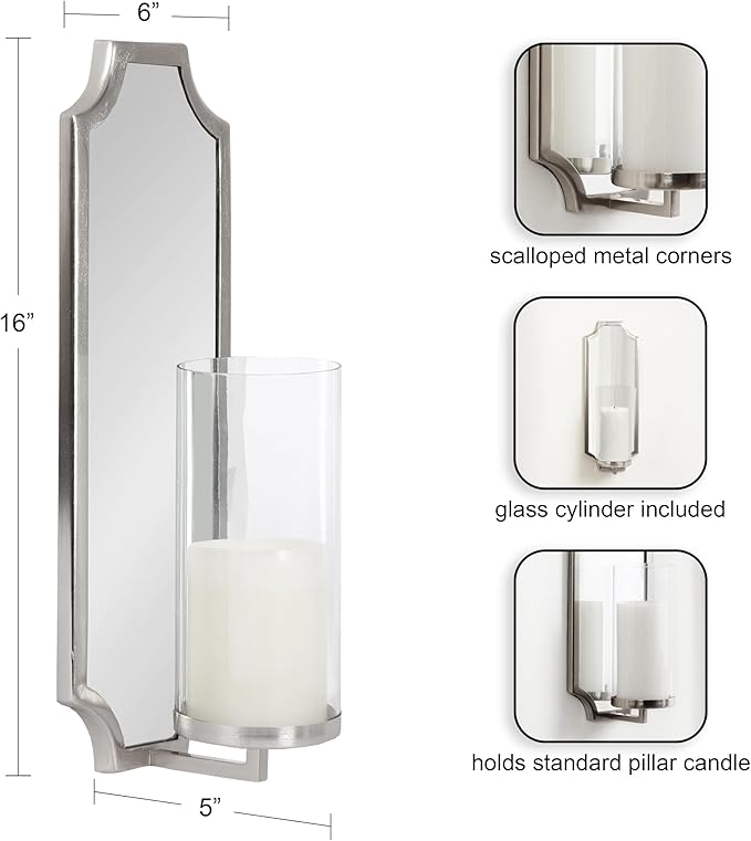 Kate and Laurel Ciel Glam Mirrored Wall Sconce; 6 x 5 x 16; Silver; Traditional Scalloped Candle Holder with Removable Glass Cylinder and Mirror for Bathroom or Bedroom Wall Decor