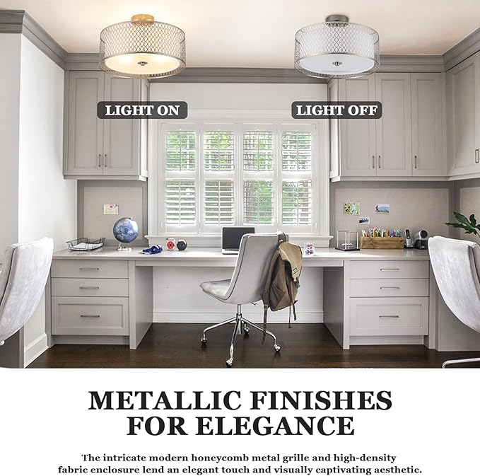 - 【Flush Mount Design & Modern Style】 The 120V semi flush ceiling light (Honeycomb Iron Shade Diameter:17 inch /430mm, Lamp Height: 10inch /254mm ) featuring a burshed nickel metal shade and vintage style black matte metal base, bringing a modern twist to its Avant-garde retro design.