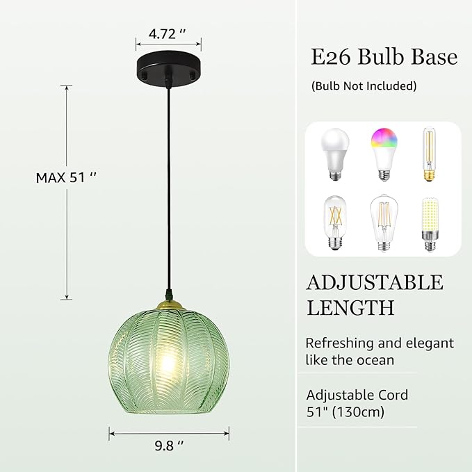 - E26 Base Island Light Fixture -- This modern chandelier requires 1 x E26 base bulb (Max 60W), compatible with LED, CFL, incandescent, and halogen bulbs (BULBS NOT INCLUDED). The green glass ceiling light fixture supports dimming function as being installed with a dimmable bulb and compatible dimmer switch (NOT INCLUDED)