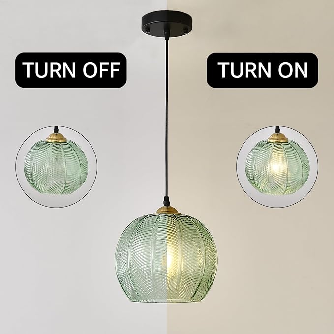 - Vintage Green Pumpkin Pendant Light Design -- This globe pendant light fixture with diameter up to 9.84 inch features ribbed glass lampshades and a black ceiling canopy. The green spherical glass shade is textured with leaf vein patterns, enhancing its aesthetic appeal while the light becomes soft and inviting through the refraction of the green glass shade. This versatile light is the perfect pick to add a touch of modern and nature sense wherever you install it, fitting right into traditional decor and modern farmhouses alike